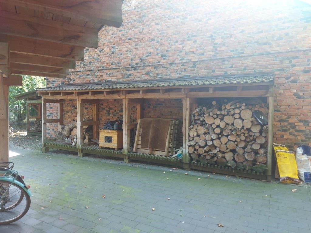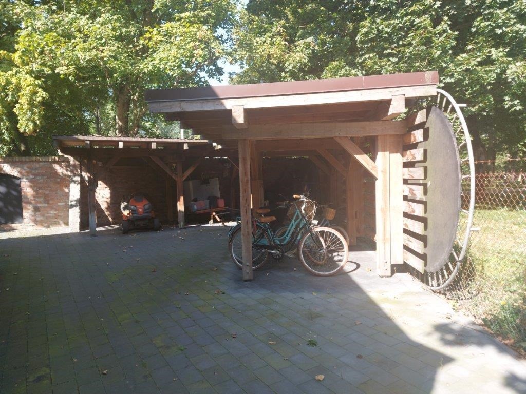 Projektowo stanowi spójną całość z budynkiem mieszkalnym. Przy budynku gospodarczym oraz tuż za nim znajdują się drewniane wiaty na sprzęt ogrodowy, rowery lub samochód.