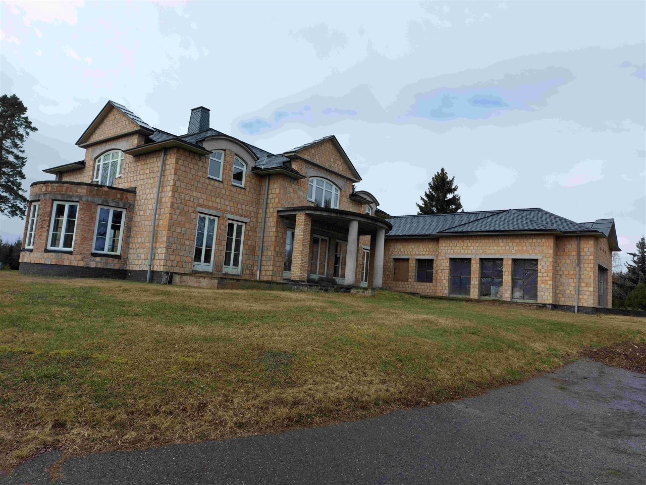 Nieruchomość stanowi grunt o pow. 3,44ha zabudowany budynkiem jednorodzinnym w stanie surowym zamknietym o pow. użytkowej ok 600m2.