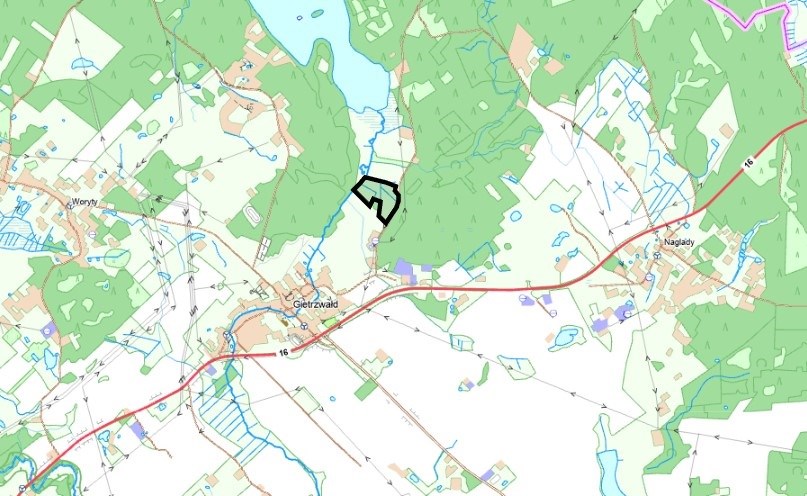 Działka znajduje się na zachodnim skraju wsi Gietrzwałd, w pobliżu drogi krajowej nr 16, około 16 km od Olsztyna. W okolicy znajduje się znane Sanktuarium Maryjne - Bazylika Narodzenia Najświętszej Maryi Panny oraz jezioro Giłwa.