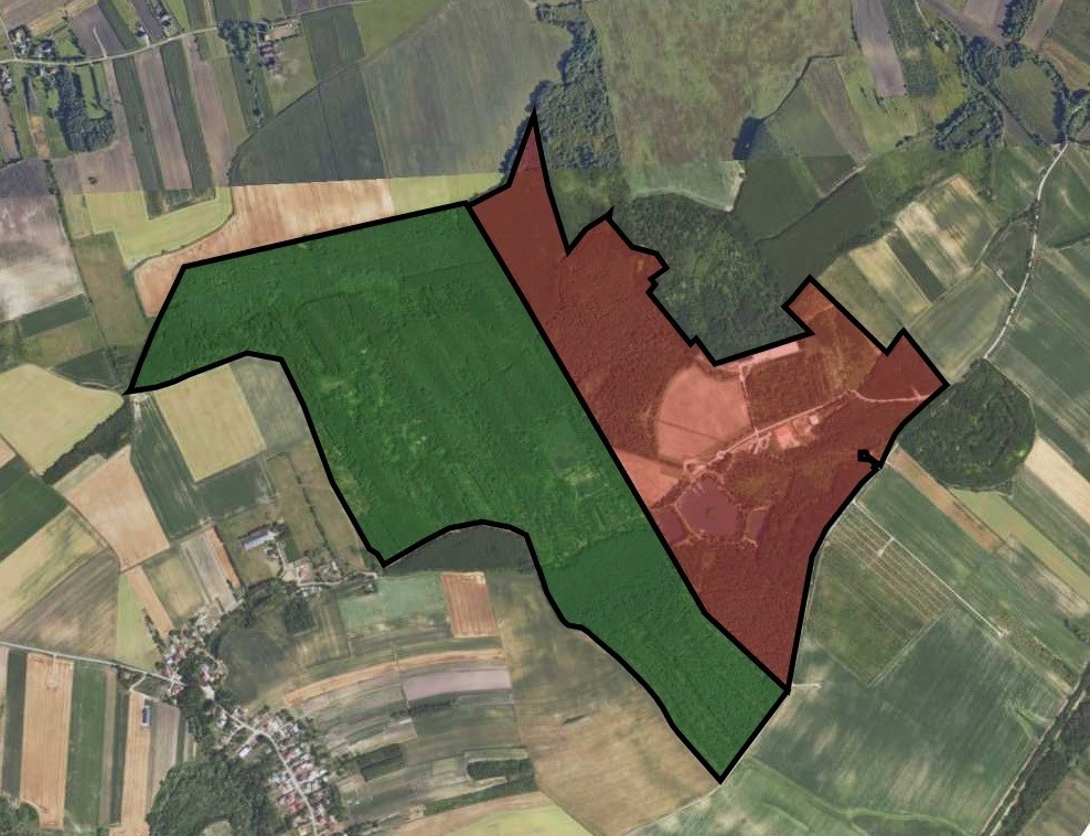 Informujemy o możliwości nabycia terenów sąsiadujących o pow. 50 ha (oznaczonych na grafice kolorem czerwonym) na podstawie Umowy sprzedaży bezpośrednio z właścicielem nieruchomości.